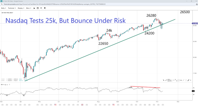 Nasdaq erased its Friday losses to return back above the major trendline connecting the April and October bottoms, forming a pinbar above the 25k handle. If the buy-the-dip paradigm continues, the tech index could revisit record territories, given 25680 and the prior record of 26280 open the door to 26500 and beyond. However, RSI divergence on the daily remains a concern. The bounce could be a simple correction to 25500-26000. If bears manage to push the price under 25k and the swing support of 24600, the next support zone lies at 24000-24200. A break below would expose 23000 and 22650.