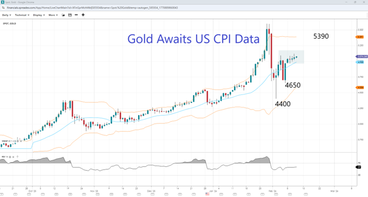 Friday marks the release of January CPI figures, with the headline rate expected to dip to 2.5% from 2.7% a month ago, primarily due to a drop in fuel costs. The core rate is anticipated to cool at a more modest rate to 2.5% from 2.6% prior, above the Fed's 2.0% target. Markets are pricing in a more than 90% chance that the Fed will keep rates unchanged at the upcoming March meeting (up from around 80% before the jobs data). An unexpectedly large drop in inflation could bring back the possibility of a rate cut, which could support gold. However, hotter inflation would likely weigh on gold prices as the market pushes forward expectations of Fed easing.