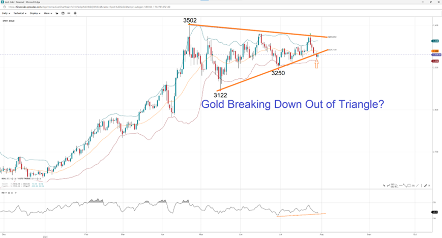 Recent improvement in risk sentiment after major trade deals were announced has pushed gold below the lower triangle trendline it has been trading in. The yellow metal could extend to the latest swing low at $3250 per ounce if this turns out to be a breakdown, with the next support at the prior swing low at $3122. However, if the pattern holds above $3250, a triangle validation above the upper trendline and Bollinger Band near $3410-$3430 could expose the all-time high at $3502, followed by fresh records.