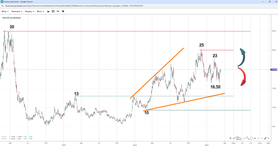 Aluminium is of particular interest, as the US has only four remaining primary smelters due to high energy costs, which have led Alcoa to shift its domestic production to overseas facilities (subject to tariffs). Two of these smelters (Sebree and Mt. Holly) are operated by Century Aluminium, which was keeping the Mt. Holly site at half capacity. Century Aluminium could potentially be one of the stronger beneficiaries of the tariffs. It trades at a P/E ratio of just 5.9x, with analyst consensus giving it a price target of $25 per share, a potential upside of almost 30%.