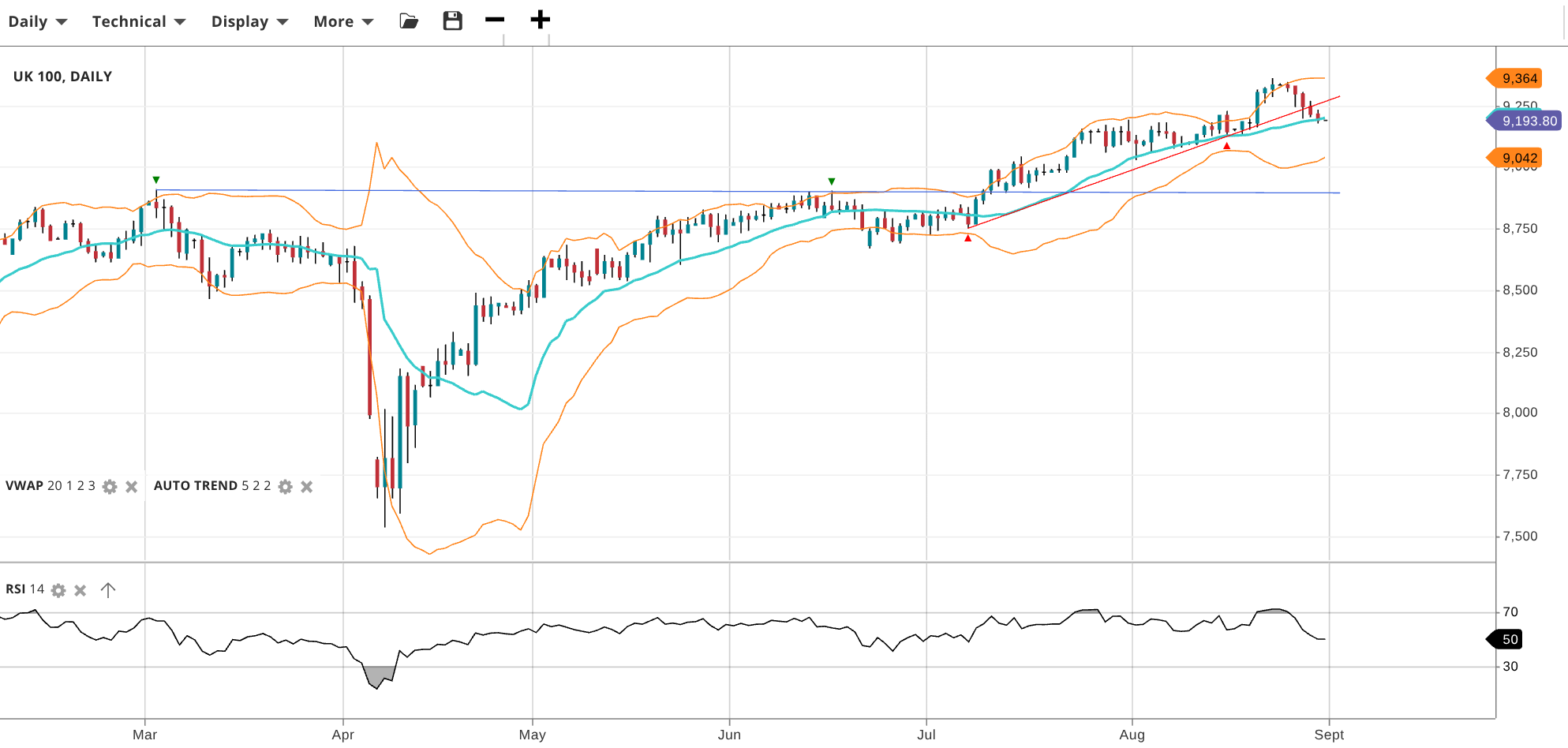 NOTE: These charts use the ‘Pro Trading Tools’ available on the SpreadEx trading platform. To use them, log in to your SpreadEx Financials Account and click ‘Technical’ from the menu on any chart.