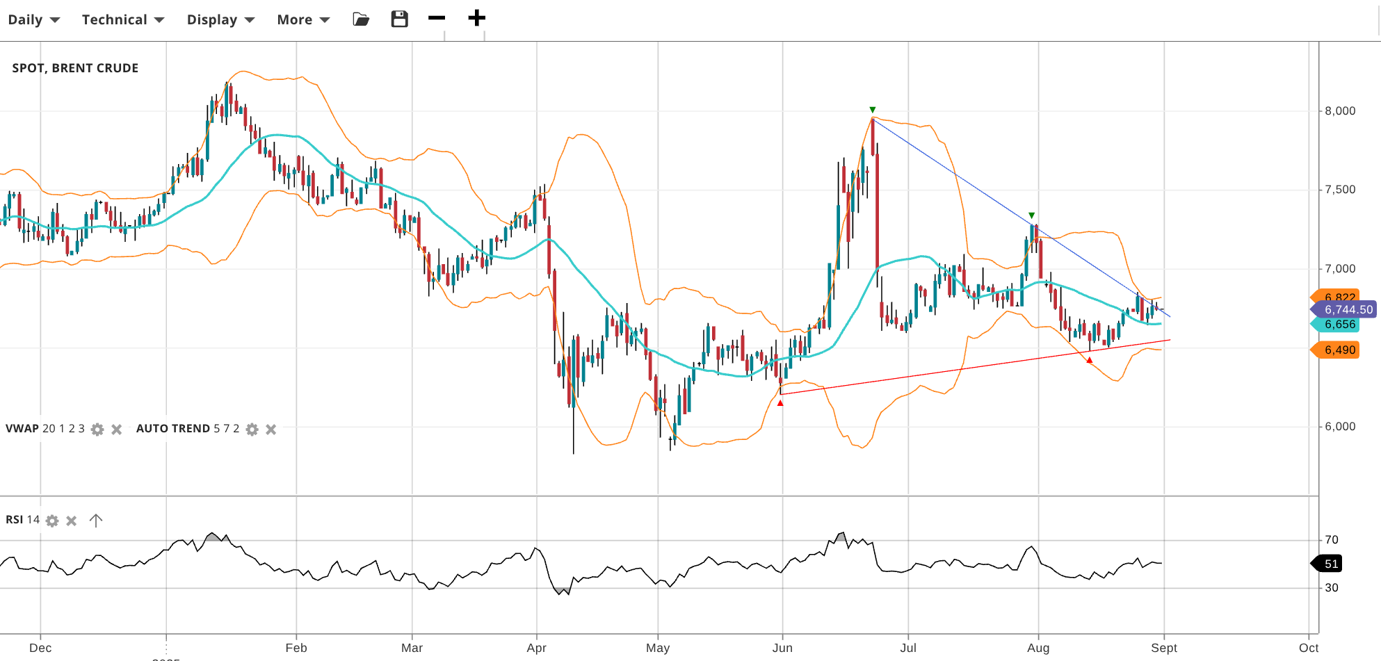 Brent Crude is still in a choppy range, at 6,745 the price is back above its VWAP of 6,656. RSI at 51 reflects neutral momentum. Support stands at 6,490, resistance at 6,822.