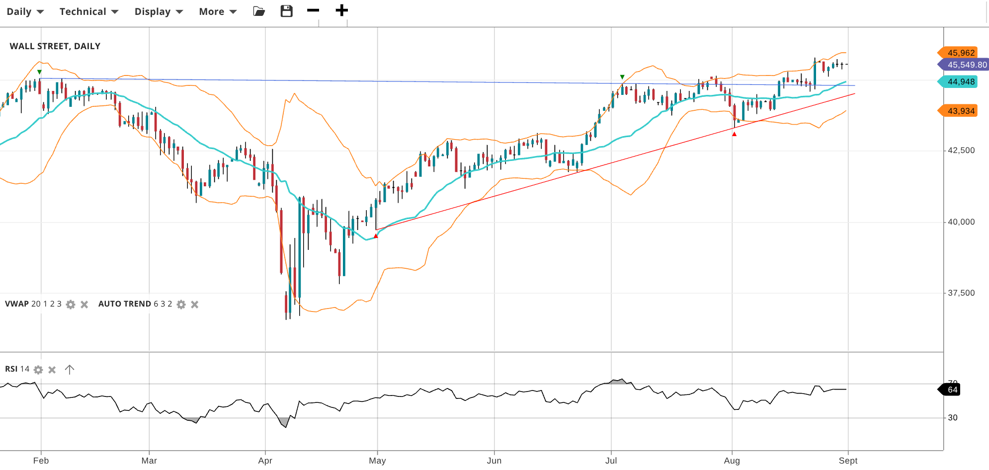 Wall Street has entered a new bullish trend and is consolidating under record highs, last at 45,550 above its VWAP 44,948. RSI at 64 leans bullish. Support is 43,934, resistance 45,962.