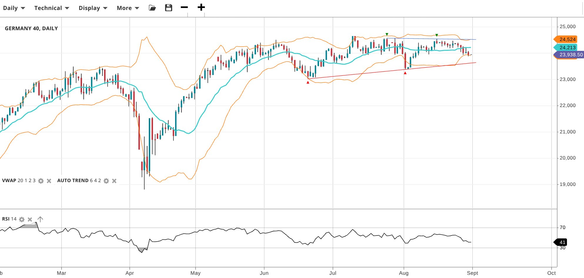 Germany 40 is range-bound at 23,938, under its VWAP of 24,213. RSI at 41 signals weaker momentum. Support at 23,00 is being tested while resistance is 24,524.