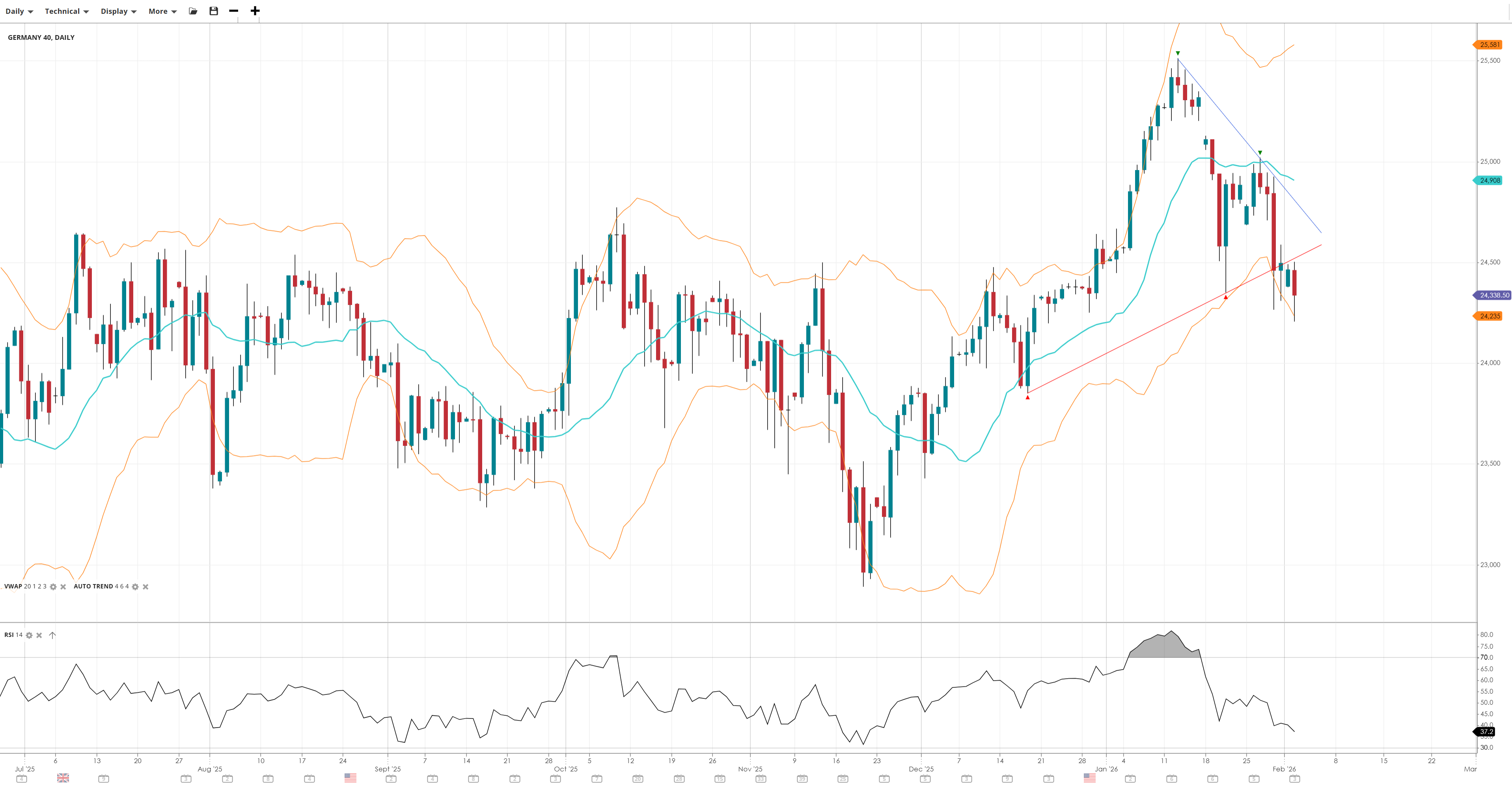 Germany 40 is just about hanging on to its bullish trend and is attempting a rebound from a steep correction, with price action well below the VWAP. Momentum has dropped off with RSI back under the 50 level, indicating a pause in the uptrend with support from the prior low intact.