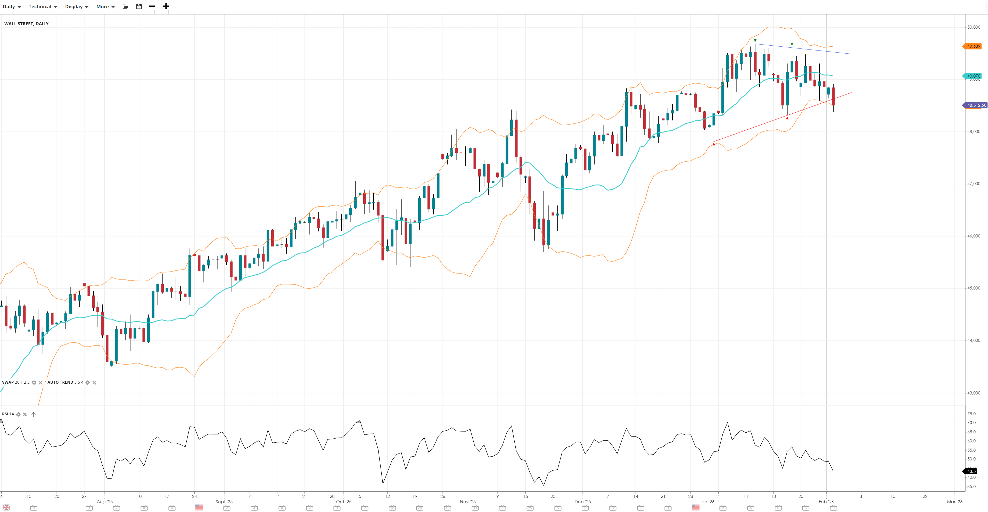 Wall Street is undergoing a sideways correction within its broader bullish trend, with price trading below the VWAP. The big 50k level overhead could be contributing to some distribution but no bearish reversal has been confirmed.