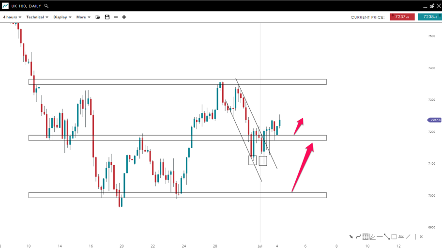 Brent Crude Oil is currently traded inside a parallel channel formation which is made of a key strong support and resistance level with the following price values: 107 & 115. The market posted an engulfing bullish pattern near the lower end of the range which led to a reversal and a move higher. This move to the upside might continue all the way up toward the June high at 124.