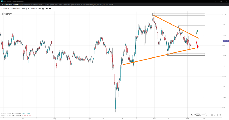 GBP/JPY could validate a pennant pattern on its way up to 169.00 so long it breaks past the descending trendline coming down from the peak of 172.13. 163.00 is major support below 164.00 as its break could invalidate the pattern.