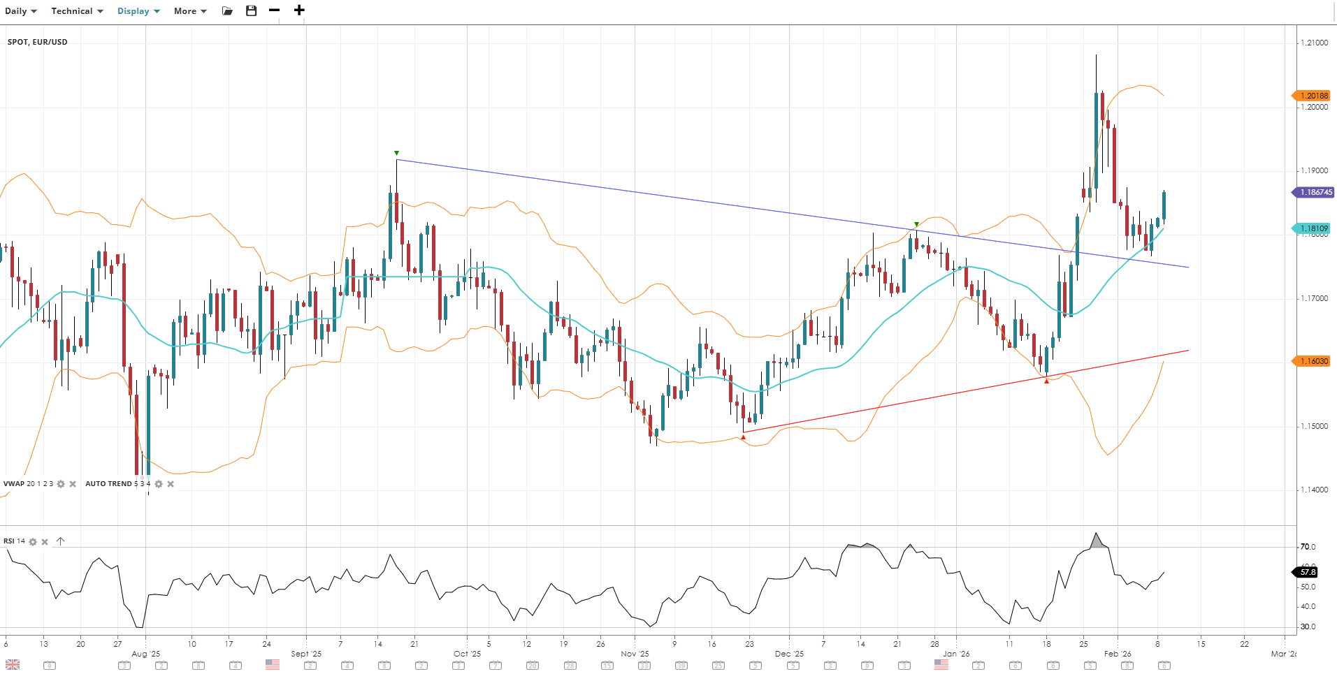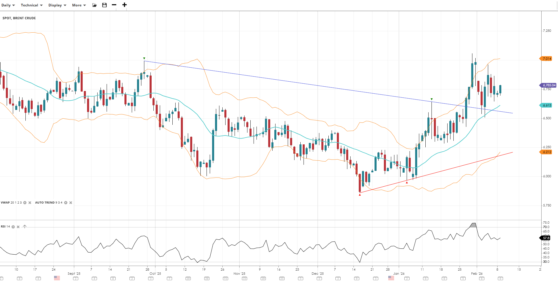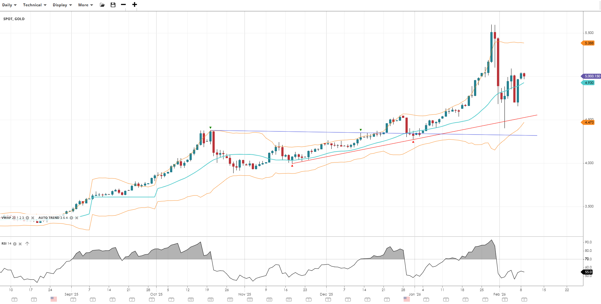 Gold is inside a choppy range in the lower half of last week’s brutal sell-off candle. It is trading above 5,000, above the VWAP. Momentum has improved with RSI crossing back above 50, suggesting the correction may be complete. The bullish trend is attempting to resume with support now at 4,470.