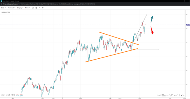 The stock price of SHELL has broken a triangle pattern and could head to 32.50 (the measured-move projection) before pulling back. While above 26.20, the probability of upside remains elevated, with a break under the triangle high of 29 still seen as short-term.