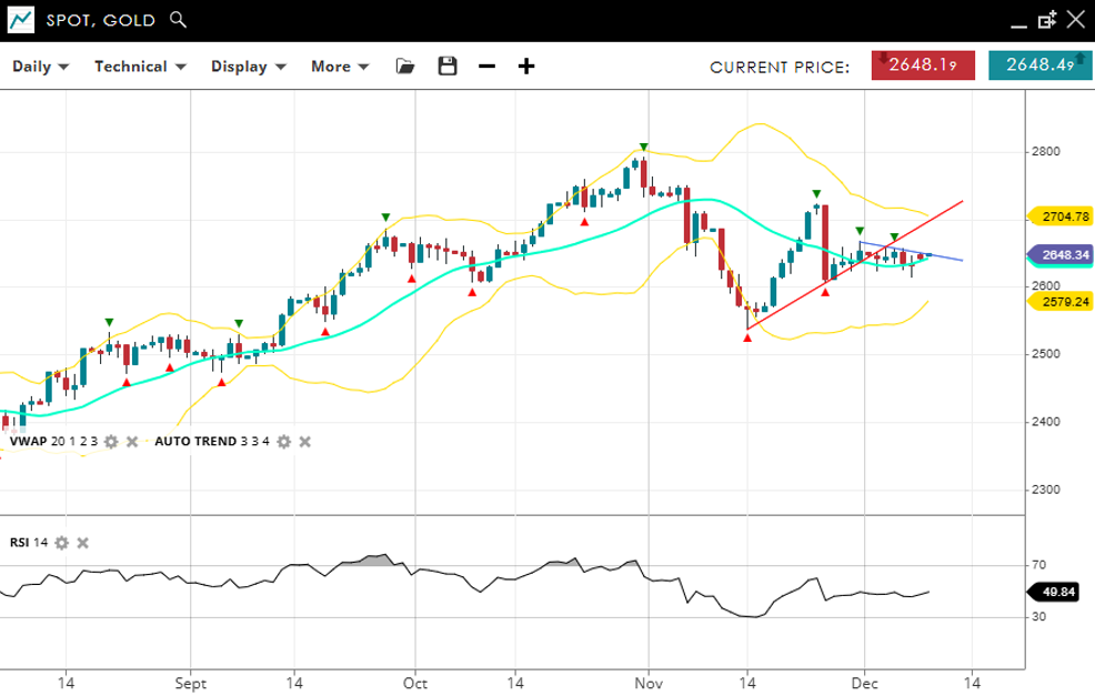 Gold remains in a neutral consolidation state, trading at 2,648, now slightly above the VWAP (20) of 2,640. Support is identified at 2,579, with resistance at 2,704. The RSI at 49 indicates balanced momentum, consistent with a lack of clear direction in the current price action.