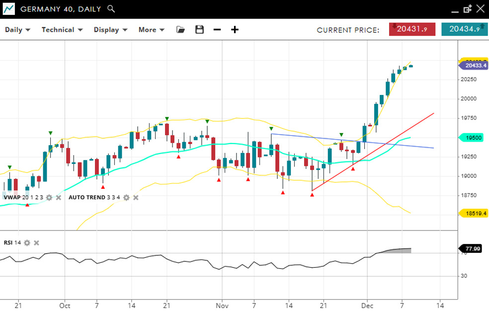 Germany 40 maintains its strong bullish momentum in an impulsive phase, now trading at 20,433, significantly above the VWAP (20) of 19,500. Support is set at 18,519, with resistance narrowly ahead at 20,450. With an RSI at 77, the index shows robust momentum, suggesting the uptrend could extend further but with a greater chance of a near term pullback.