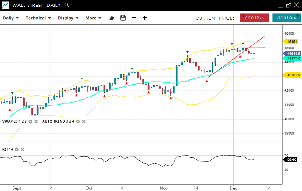 Wall Street is firmly bullish and in an impulsive phase, trading at 44,614, well above the VWAP (20) of 44,277. Support levels are marked at 43,101, with resistance ahead at 45,454. An RSI reading of 59 reflects strong upward momentum within this positive trend.