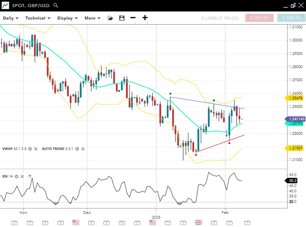 GBP/USD has also turned into a more neutral phase, trading at 1.2411, marginally above its VWAP (20) of 1.2379. Key support is found at 1.2109, while resistance stands at 1.2567. With RSI at 50, there is little momentum for a move either way.