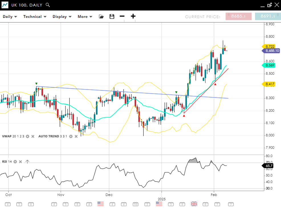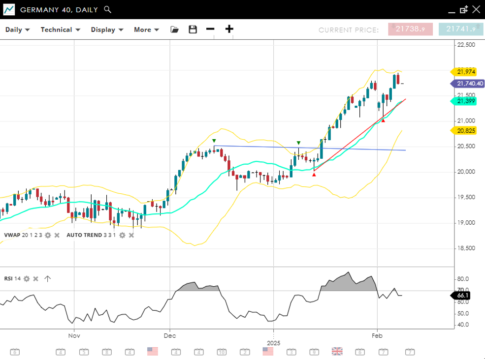 Germany 40 maintains its bullish momentum, currently trading at 21,740, well above its VWAP (20) of 21,399. The trend remains positive, with support at 20,825 and resistance at 21,974. An RSI reading of 66 signals sustained strength, though a third bearish RSI divergence is a sign a larger correction to the trend could be coming.