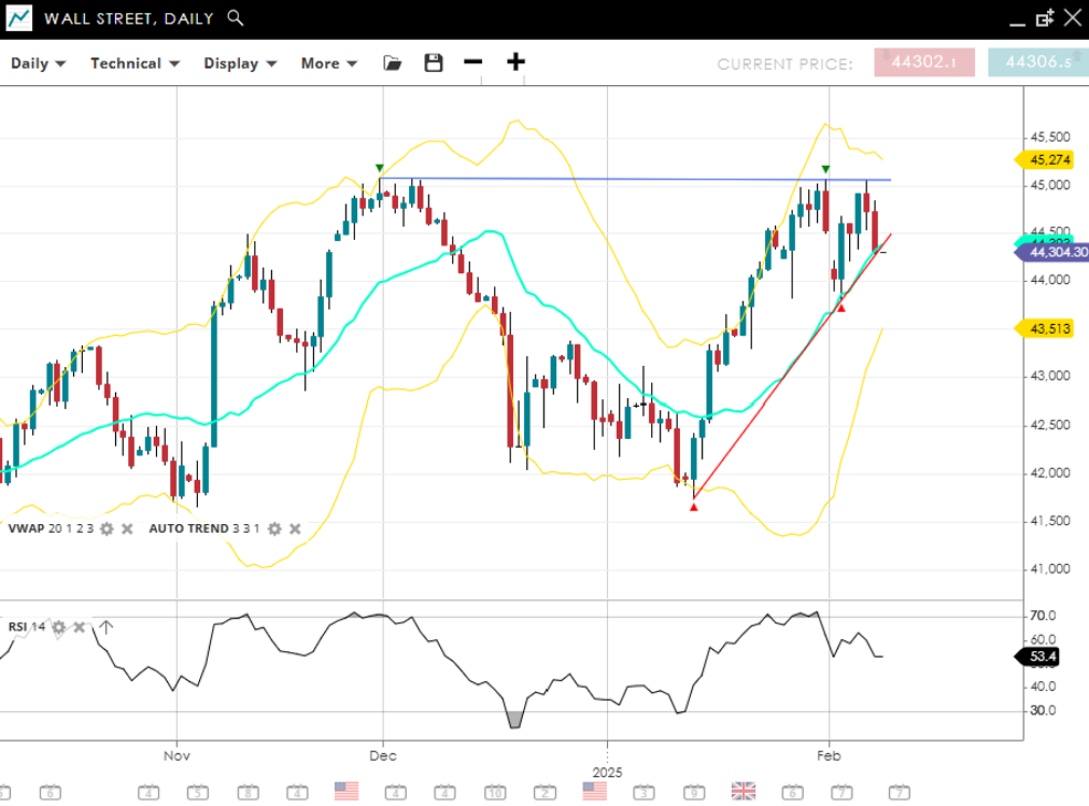Wall Street has entered a corrective phase within its broader bullish trend, trading at 44,304, slightly above its VWAP (20) of 43,920 and having made a small double top at 45,000, matching the December record high. Key support is identified at 43,513, while resistance is set at 45,274. RSI at 53 suggests moderate momentum.