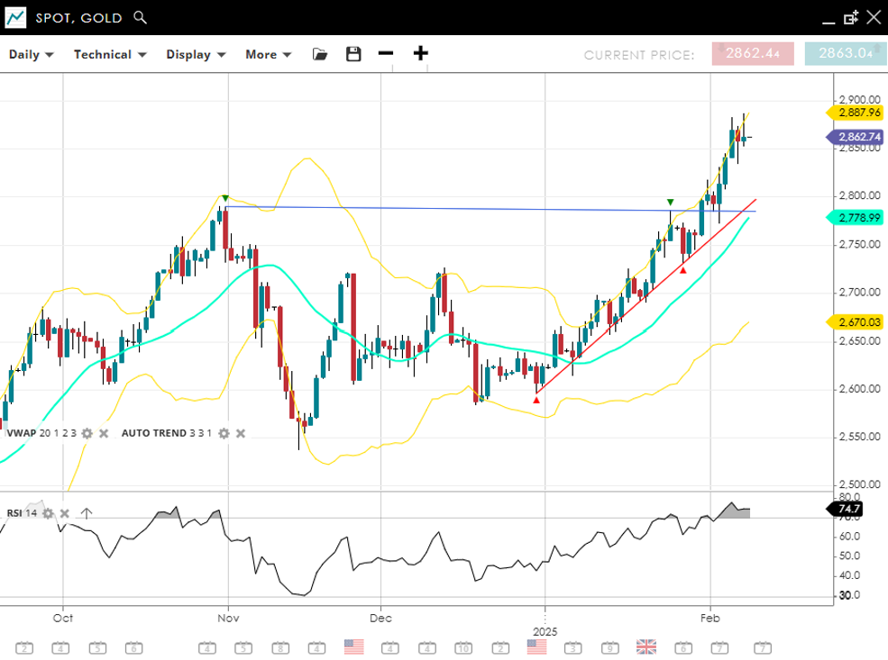 Gold remains in a very strong impulsive bullish phase, currently priced at 2,862, sitting comfortably above its VWAP (20) of 2,778 and close to a record high. Support is established at 2,670, while resistance is near 2,887. The RSI at 74 suggests overbought conditions, hinting at a possible pullback or consolidation before the next rally.