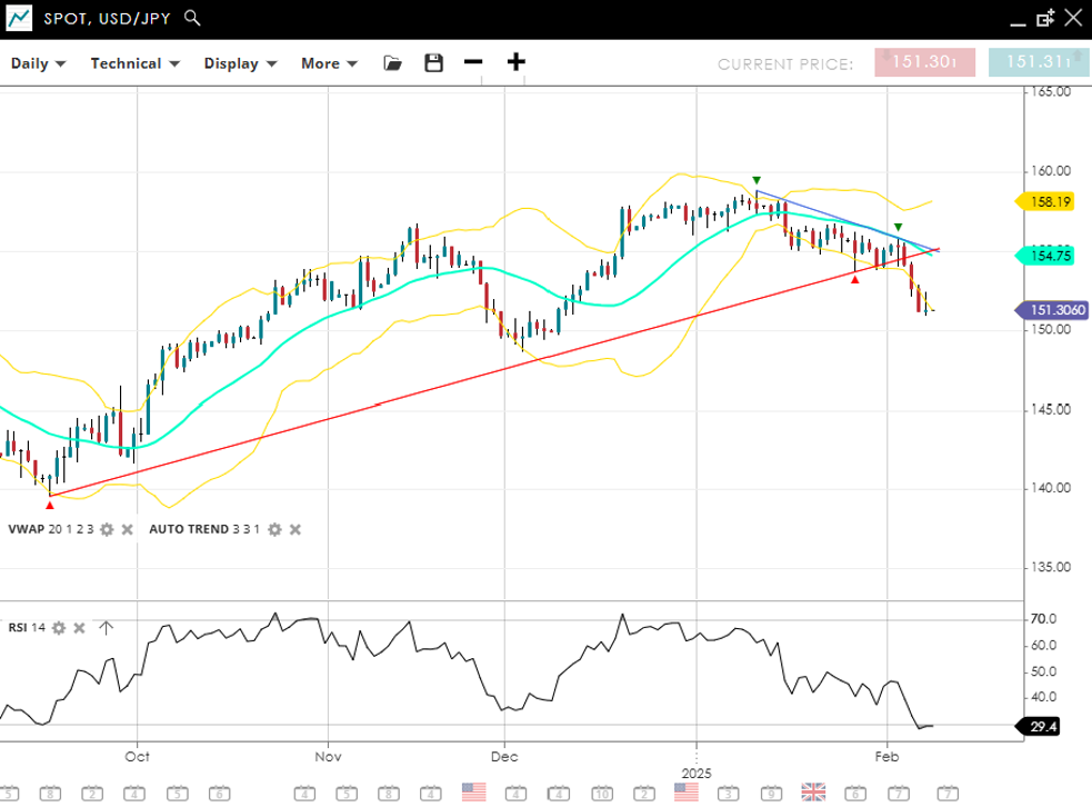 With the break of a long term trendline, USD/JPY has flipped into a bearish impulsive phase, currently at 151.30, well below its VWAP (20) of 154.75. Support is firm at 151.30, while resistance extends to 158.19. The RSI at 29 signals oversold conditions, confirming the new bearish trend in price.