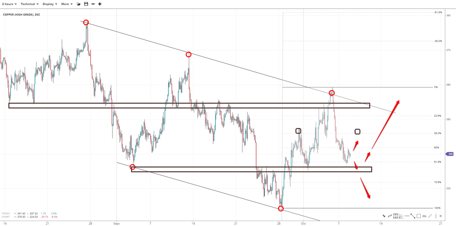 Copper plunged to the golden pocket at 337.00 after peaking at 360.00, with the next Fibonacci at 332.00 unless the 335.00 support holds firm. A potential head-and-shoulder pattern might send prices to 38.2% of 325.00-360.00 near 345.00 to form the right shoulder. If the resistance stops bulls, a slide might ensure. Otherwise, the ascend might continue towards 360.00 if the 23.6% and the descending trendline around 350.00 break.