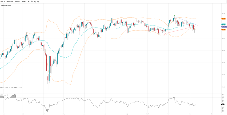 Germany 40 is neutral and ranging, with price at 23,932 slightly below the VWAP of 24,139. RSI at 46.2 reflects limited directional conviction. Support is at 23,693, resistance at 24,586.