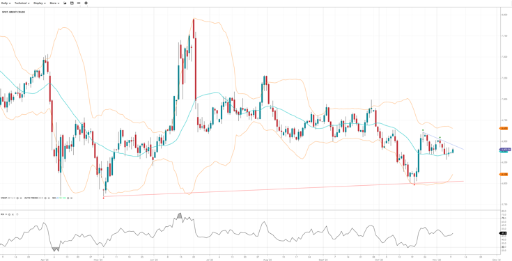 Brent Crude is neutral and range-bound, trading at 6,406 near the VWAP of 6,381. RSI at 49.3 confirms indecision with neither side dominant. Support is at 6,108, resistance at 6,655.
