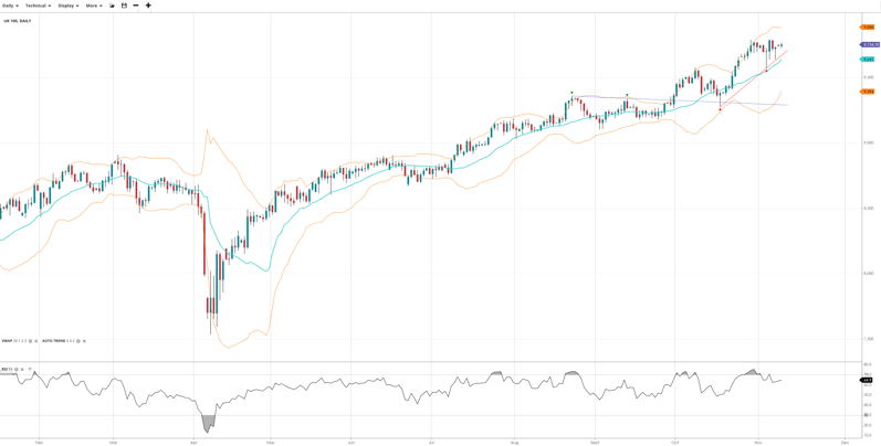 UK 100 continues its bullish trend but is in a short-term pullback. Price at 9,754 trades above the VWAP of 9,641. RSI at 64.9 indicates firm momentum. Support sits at 9,394, resistance at 9,888.