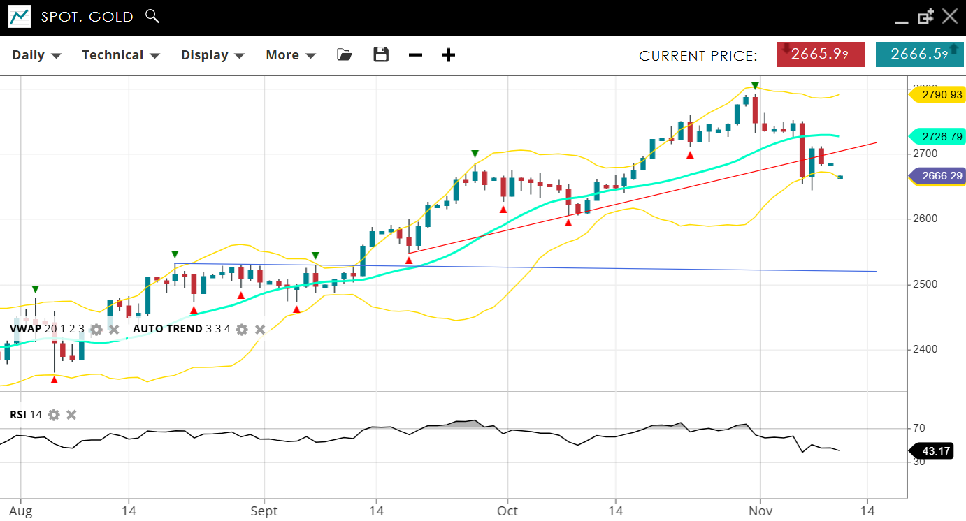 Gold continues to exhibit bullish behaviour overall but has entered a sharp correction - its largest in a number of weeks. It’s priced at 2,666, below the VWAP (20) of 2,726 and testing the lower 2 period standard deviation of the VWAP (Support) at 2,660, with resistance at 2,790. An RSI of 43 reflects new bearish sentiment, with a drop below 50 not seen in months.
