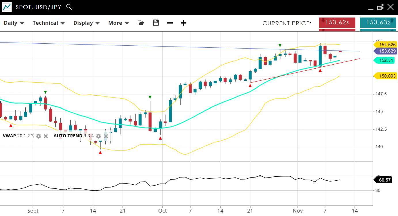USD/JPY holds a bullish, impulsive phase, trading at 153.62, above the VWAP (20) of 152.31. Support is set at 150.09, while resistance lies at 154.52. The RSI at 60 reflects continued bullish momentum within its uptrend, and still some way off overbought levels.