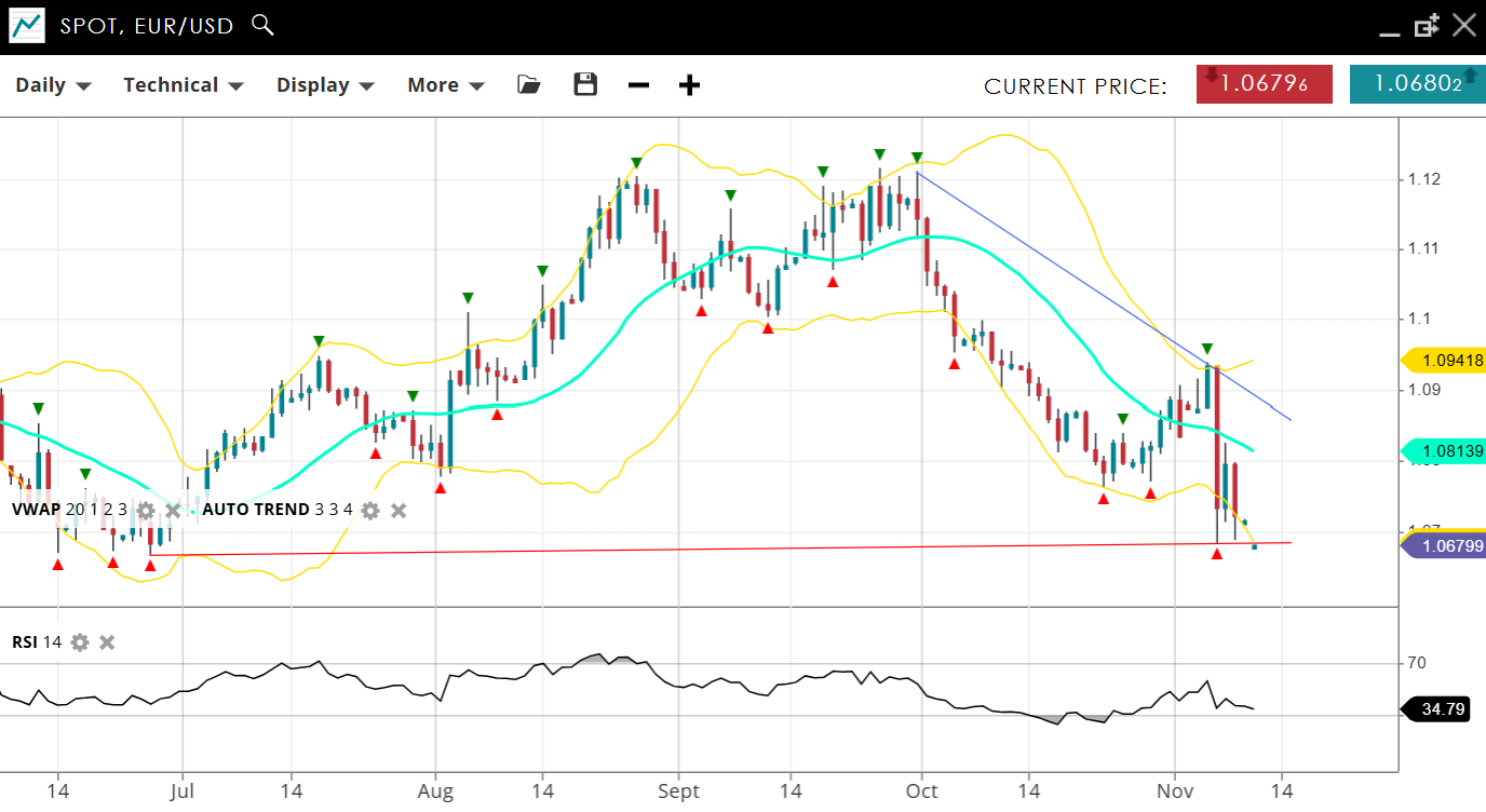EUR/USD remains in a bearish, impulsive trend coming off the back of a massive 300 pip 1-day decline last week and currently trading at 1.0679, below the VWAP (20) of 1.0813. Support is nearby at 1.0685, with resistance up at 1.0941. The RSI at 34 indicates downward pressure, suggesting limited bullish attempts to reverse the trend.