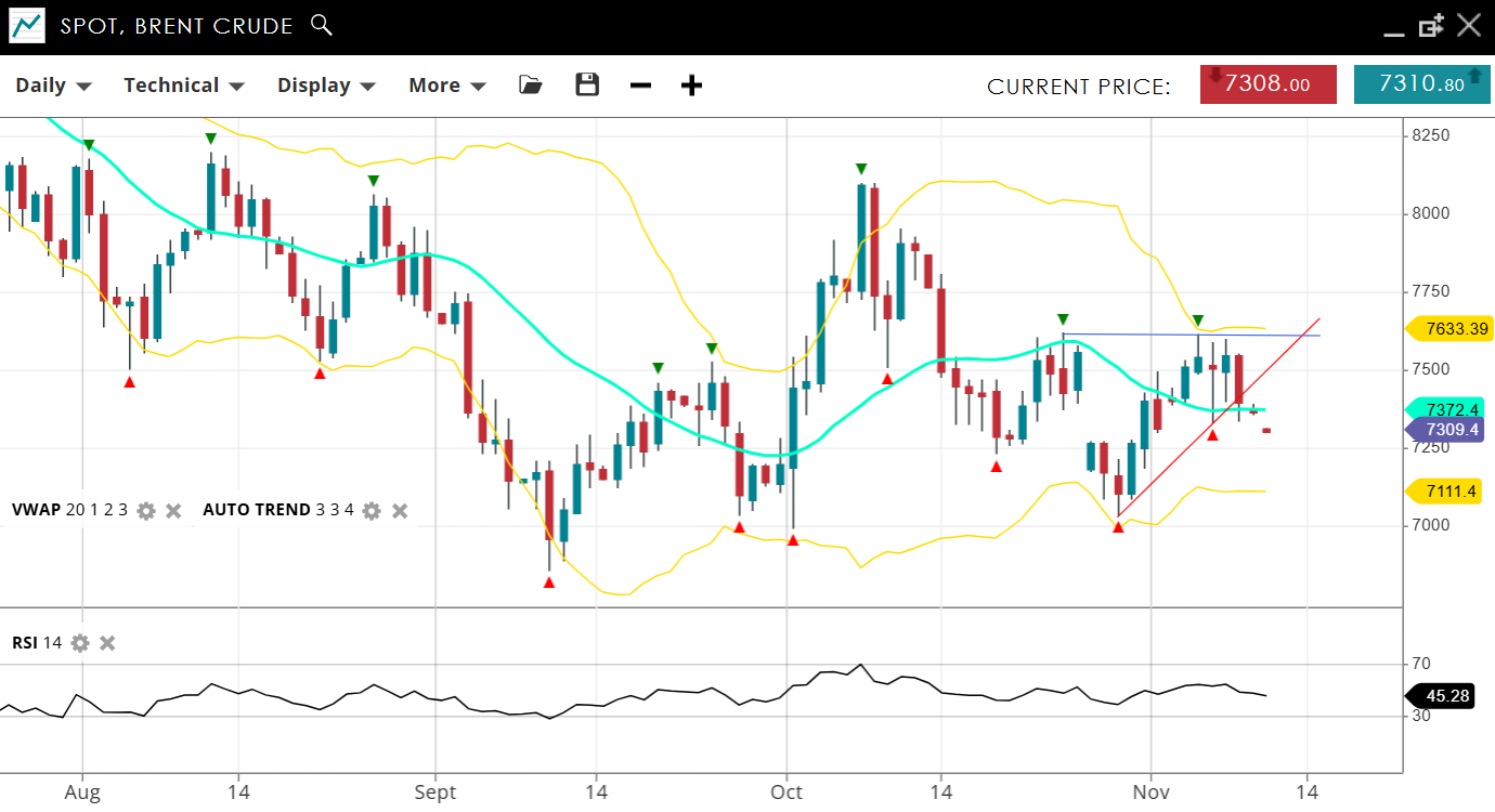 | Brent Crude | Neutral | Consolidation | 7309 | 7372 | 7111 | 7633 | 45 |