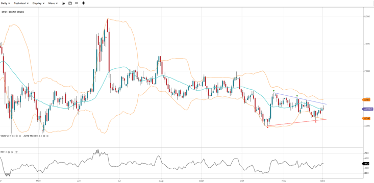 Brent Crude remains in a neutral range, having avoided a breakdown below the key 6,000 figure, trading at 6,310 on top of its VWAP of 6,300. RSI at 49.3 indicates balanced conditions. Support is at 6,140, with resistance at 6,481.