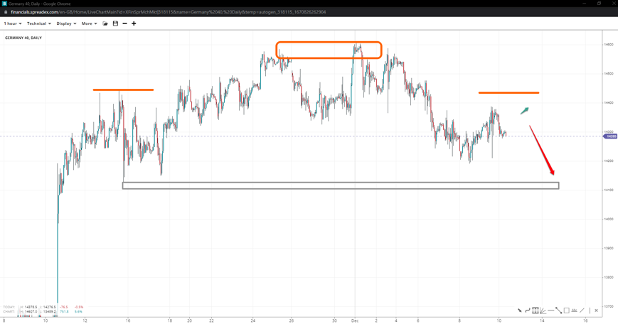 Germany’s 40 index pattern resembles a head-and-shoulder pattern, with the right shoulder incomplete as the neckline at 14120 hasn’t been tested yet. 14450 is the shoulder peak, and if it is reached first, the index might decelerate towards 13500. Otherwise, it might rise to 14600 and above for a new peak.