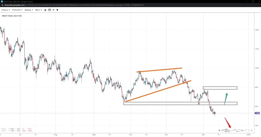 Brent crashed below 80.70 following a bounce to 89.40 last week and completing a flag. With 75.00 acting as support, an upward spiral near 80.00 might be seen. If bearish momentum increases, it might pave the way towards 70.00.