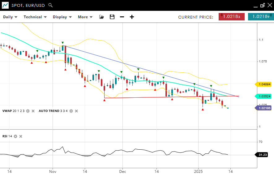 EUR/USD persists in its bearish impulsive trend, trading at 1.0218, below the VWAP (20) of 1.0352 - a fresh multi year low. Support is around current levels, and resistance is identified at 1.0489. The RSI at 31 suggests near oversold conditions, signaling little evidence of any bullish turnaround.