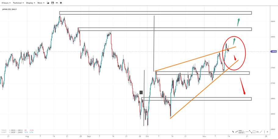 Japan 225 seems to have broken outside its rising wedge pattern, opening the door to 28700 and 29300 as long as the bottom trendline holds. If 27400 is lost, a deeper correction might be seen, with support at 26500 and the previous low of 25600. Typically, the breakout leads to a move equal to the first leg’s height, which brings us to 29200.