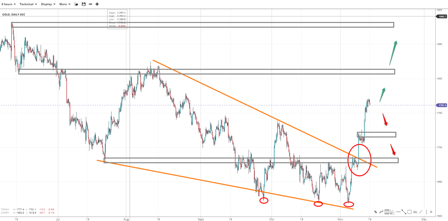 Gold has completed a falling wedge pattern after breaking above the descending trendline, with 1830 back on the radar as a possible upside target. Due to the extended upward leg, a pullback to 1730 might be seen, with 1680 likely to reverse most of the gain down to 1625. Otherwise, an attempt at 1890 might begin.