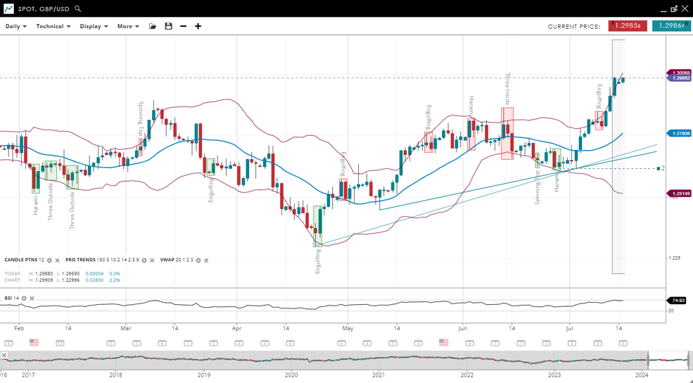 EUR/USD has broken out from its previous downtrend but the new uptrend needs to take out the June high to be sustainable. It is now well above the VWAP of 1.0783. Support has adjusted higher to 1.0637, while resistance has increased to 1.0929. The RSI has increased to 67, indicating a reduction in bearish pressure.