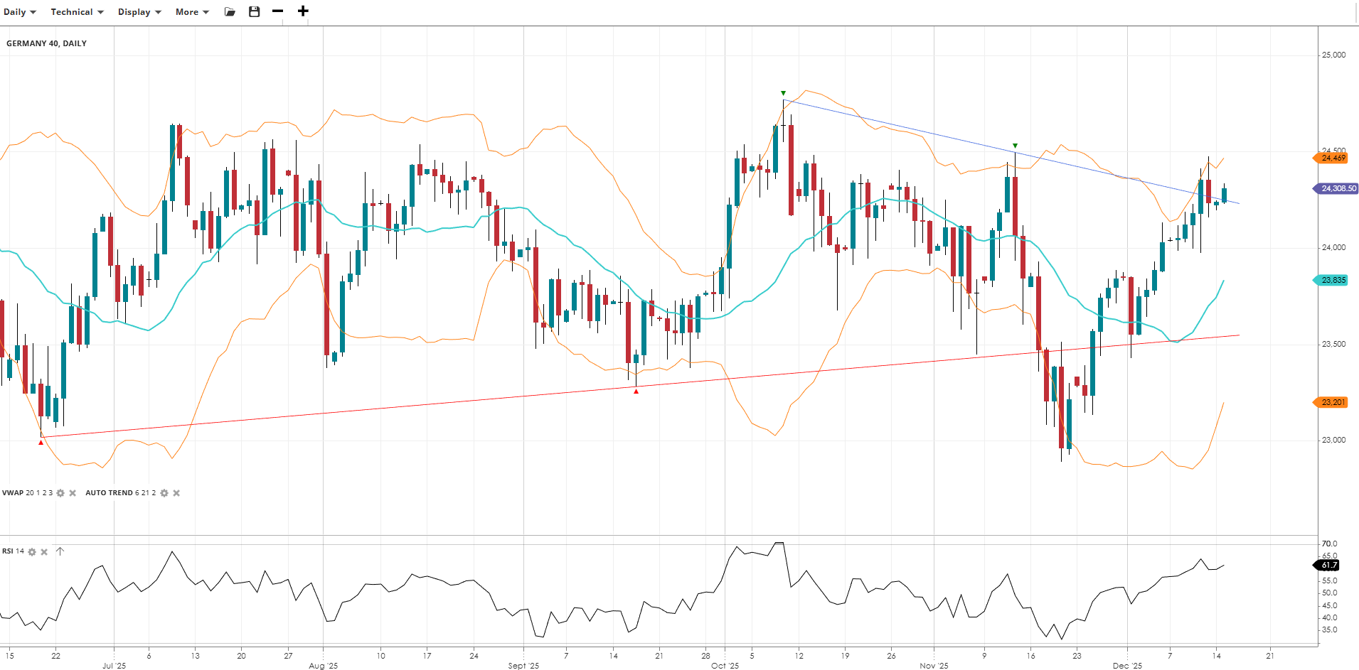 Germany 40 is trending higher within its ongoing neutral range, trading at 24,309, above its VWAP of 23,835. The RSI at 61.7 indicates strong momentum. Support is at 23,201, with resistance at 24,469.