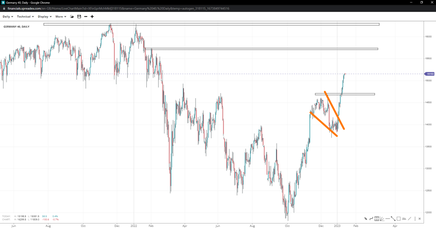 Germany’s 40 index made its way up to a 1-year high above the 15k handle with near-term resistance below the 16k ceiling at 15740. Maintaining a position above 14700 could accelerate the trend as the pennant pattern is confirmed.