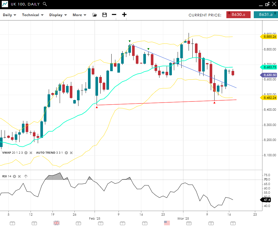 The UK 100 retains an overall bullish trend but has moved into a corrective posture, trading at 8 631 just below its 20‐day VWAP of 8 684. Momentum has softened, as suggested by the RSI reading of 47. Key support sits at 8 482, while 8 885 serves as the next major barrier against a renewed climb.