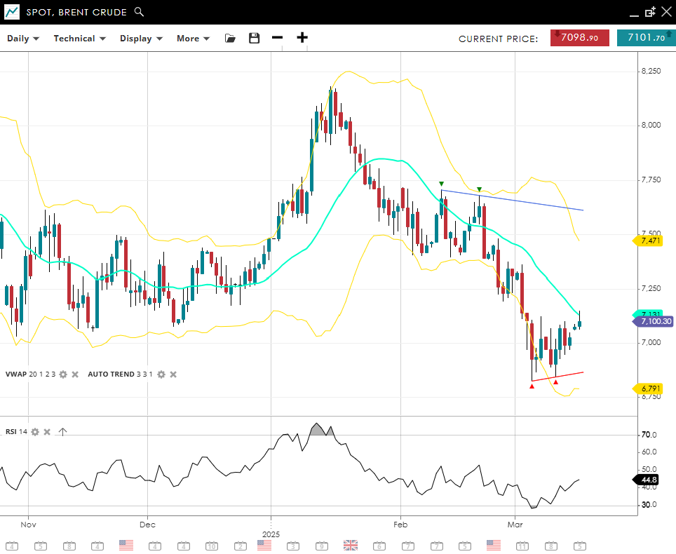 Brent Crude stays locked in a bearish, impulsive swing, currently at 7 100—still beneath its 20‐day VWAP of 7 230. The RSI of 45 reveals ongoing selling pressure, though not at an extreme. Sellers will be eyeing a break below 6 791 support to drive the next leg down, while 7 471 stands as a hurdle to further recovery.