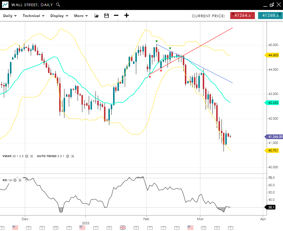 Wall Street extends its bearish momentum, posting 41 268 and remaining well under the 20‐day VWAP of 42 652. With an RSI of 30, prices are creeping toward oversold territory, signaling persistent downside pressure. Support is noted at 40 701, and any recovery attempt would first target 44 603 as immediate resistance.