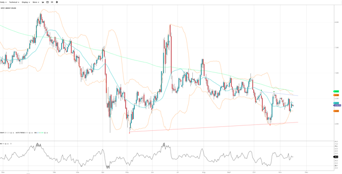 Brent Crude is neutral and range-bound, trading at 6,366 near the VWAP of 6,412. RSI at 48.3 confirms indecision with neither side dominant. Support is at 6,255, resistance at 6,568.