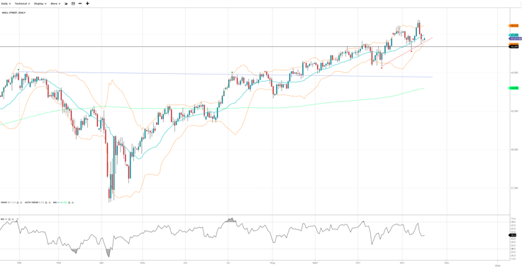 Germany 40 is neutral and ranging, with price at 23,843 slightly below the VWAP of 24,026. RSI at 44.2 reflects limited bearish conviction. Support is at 23,610, resistance at 24,410.