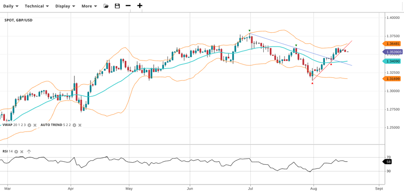 NOTE: These charts use the ‘Pro Trading Tools’ available on the SpreadEx trading platform. To use them, log in to your SpreadEx Financials Account and click ‘Technical’ from the menu on any chart.