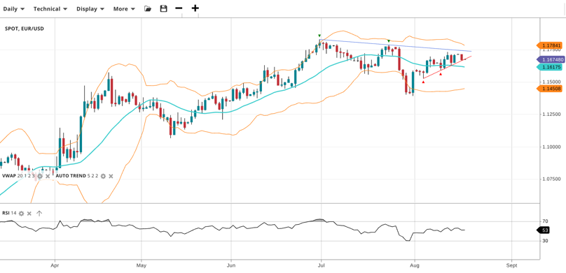 EUR/USD has corrected within its uptrend and is now testing the highs, at 1.1675 above VWAP 1.1618. RSI at 53 suggests balanced momentum. Support is 1.1451, resistance 1.1784.