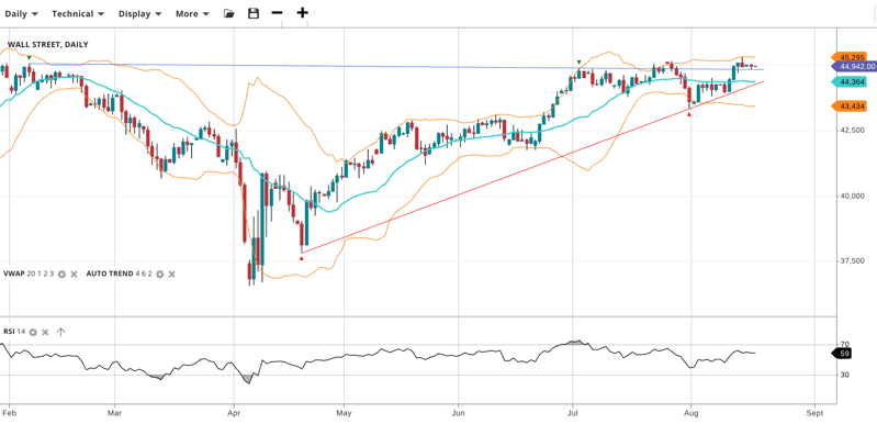 Wall Street holds a bullish trend but is correcting, last at 44,942 near VWAP 44,364. RSI at 59 leans bullish. Support is 43,434, resistance 45,295.