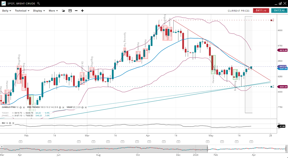 Brent Crude remains in a bearish trend but has shifted from an impulsive to a corrective phase, with the price increasing slightly to 84.12, now slightly above the previous VWAP of 83.81. Support has adjusted higher to 80.84, while resistance has decreased to 86.78. The RSI has increased to 47, indicating a slight moderation in bearish sentiment compared to the previous report.
