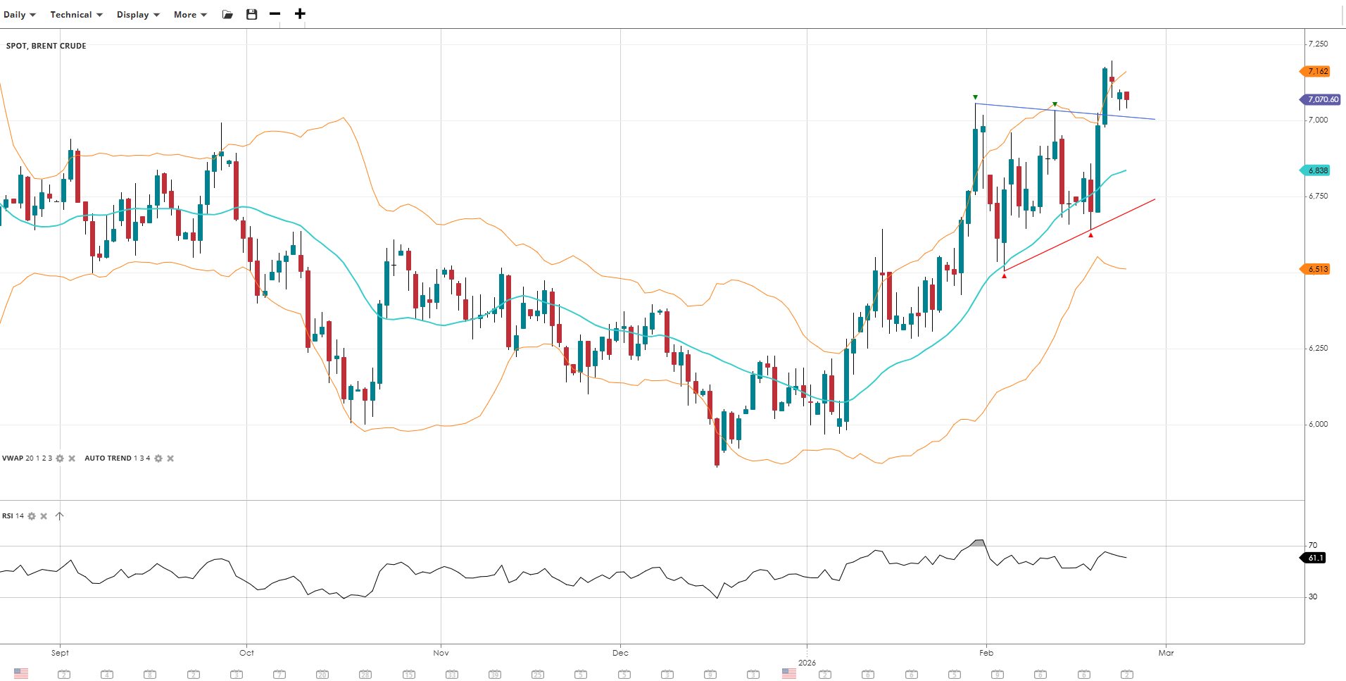 Brent Crude has pushed further above the VWAP (6,836), now trading at 7,071 and testing the key $70.00 resistance-turned-support. The RSI has risen to 61, reflecting strengthening bullish momentum. A sustained break above 7,162 would open the path to further gains, while support remains consistent at 6,513 as the uptrend remains intact.