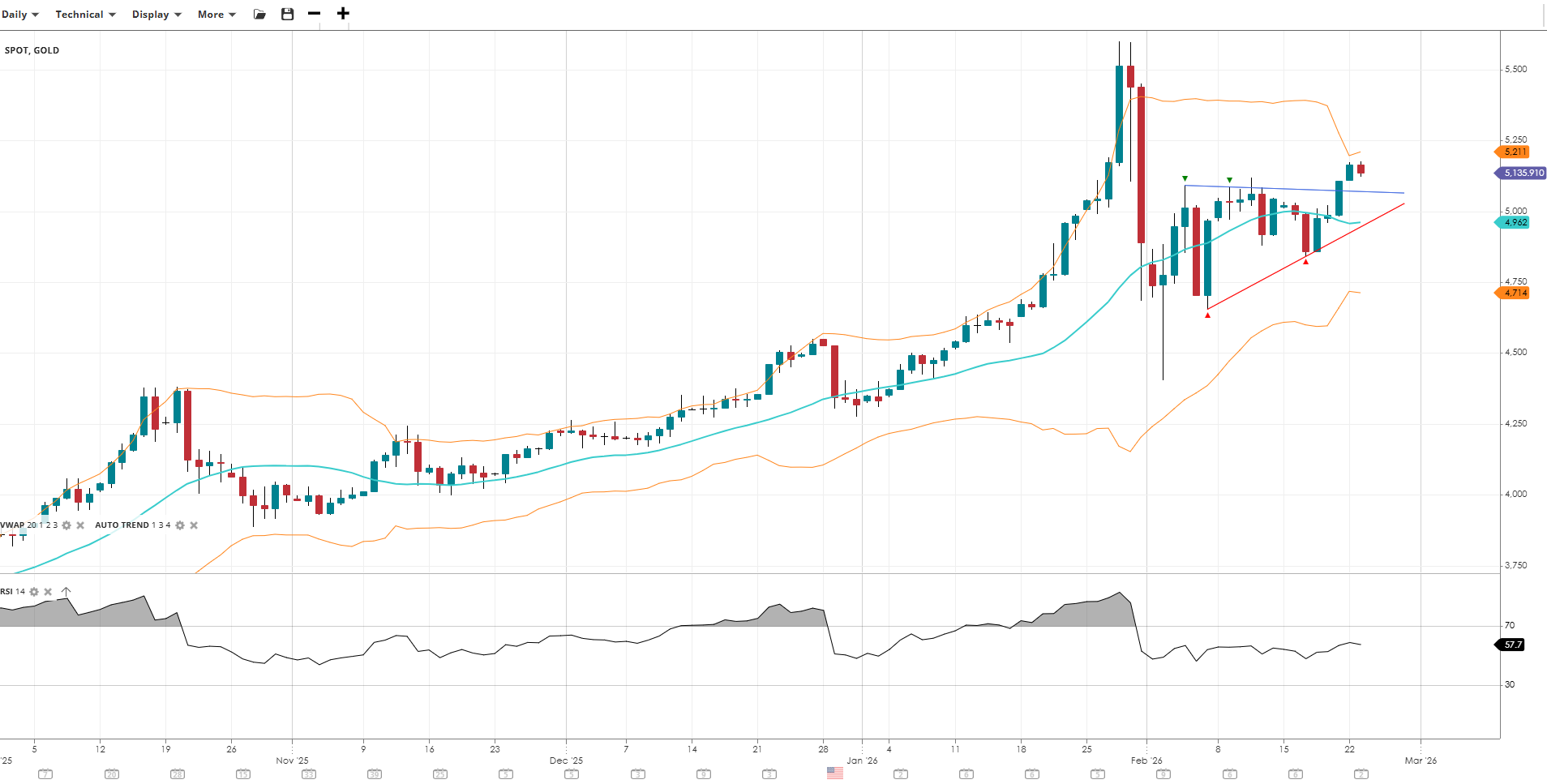 Gold is trading decisively over the 5k threshold and above its VWAP (4,962) breaking out to a near 1-month high. The RSI at 58 indicates that momentum remains positive, though still within the realms of a consolidation. The 5,211 resistance remains the key level to reclaim, while support sits at 4,714.